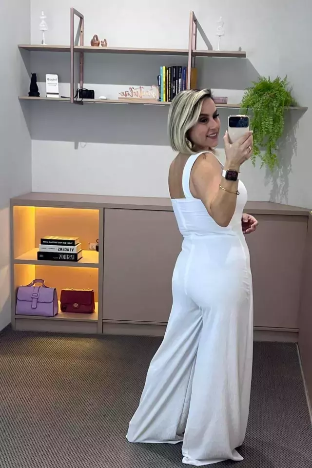 Esse macacão é a combinação perfeita entre requinte e conforto. Peça elegante, que garante sofisticação naquele evento tão esperado. Decote leve, sútil, e com um lindo decote na manga regata. Na altura das pernas há um caimento em tecido que gera leveza ao andar e dá também um lindo caimento nas pernas por ser pantalona. Tecido de excelente qualidade, que gera segurança, pois evita a transparência, além do bojo que permite o caimento perfeito na parte de cima. Com tantos atributos, podemos garantir que esse macacão é uma peça chave para se ter em seu guarda-roupas.